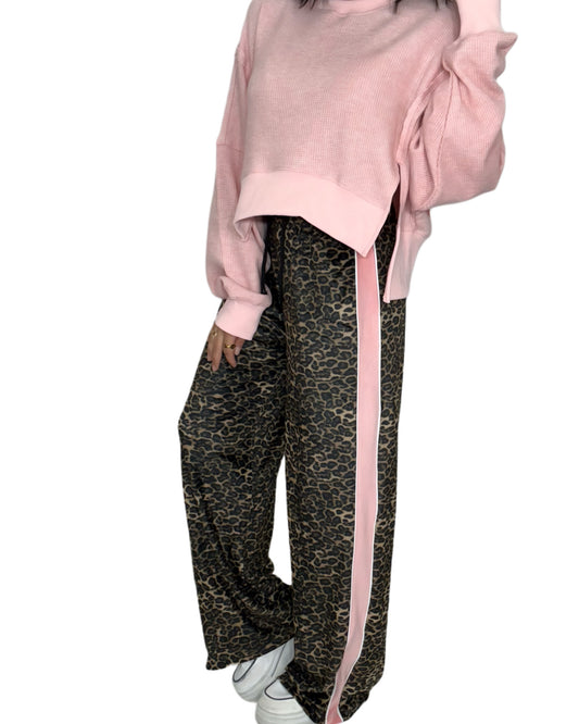 Leopard Wide-Leg Pants with Pink Side Stripe